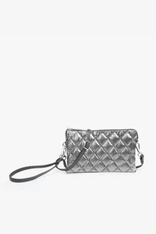 The Riley bag is one of our top sellers! This puffer crossbody/clutch has two major compartments with one middle zipper pocket and a top zipper closure. Inside are two slip pockets and six cardholders. Wear it as a crossbody or use it as a clutch! Includes a detachable wristlet strap and an adjustable shoulder strap. Made of nylon. Dimensions: 8"L x 1.5"D x 5"H.