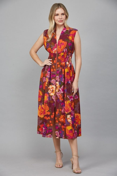 Fate Front Zip Closure Print Midi Dress Fate