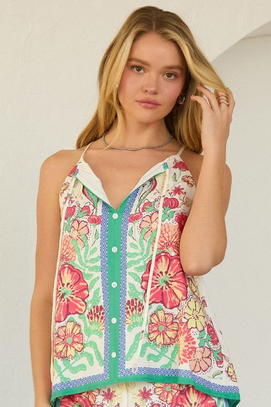 Sleeveless Border Print Halter Top A breezy statement piece perfect for warm days. This sleeveless halter top features a bold border print that adds a touch of bohemian charm. Designed with a flattering neckline and lightweight fabric, it drapes effortlessly for a relaxed yet polished look. Pair it with denim, linen pants, or a matching skirt for an easy summer outfit.