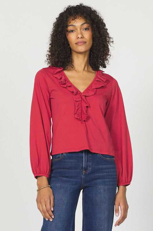 Get ready to ruffle some feathers with the Raquelle top. This playful V-neck features a unique ruffle design that sets it apart from your basic tops. Comfortable and stylish, it's the perfect addition to your wardrobe.