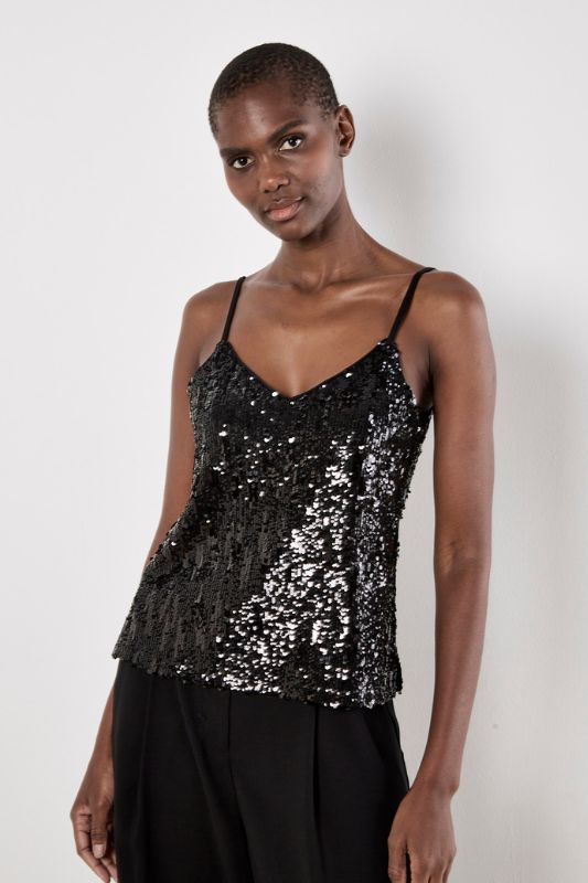 Add sparkle to your holiday wardrobe with this Sequin Cami Top. Its shimmering sequins catch the light, making it ideal for festive parties and special occasions. Lightweight and stylish, it's a chic choice to celebrate the season in style.
