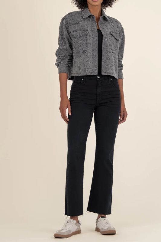 Wild meets wearable. This animal print jacket in a cool grey shade brings attitude to your outerwear with flap patch pockets, a crisp button-front closure, and just the right amount of stretch for all-day ease. Equal parts fierce and functional — your layering game just leveled up.