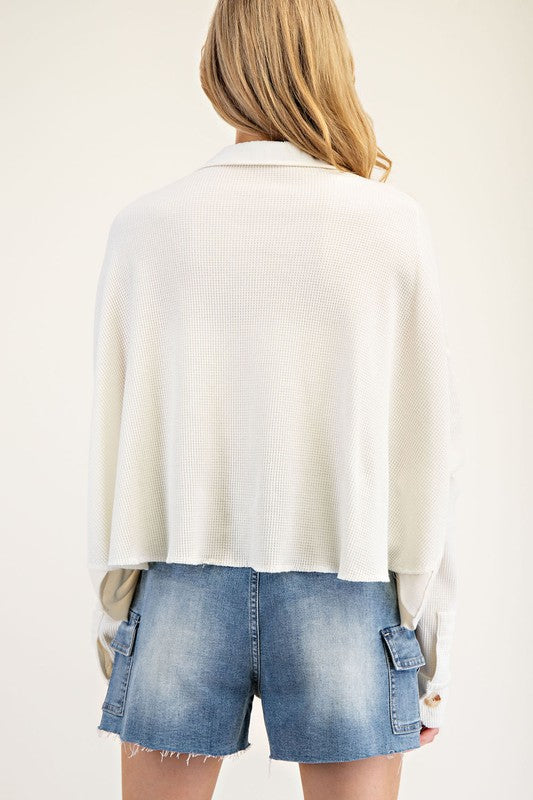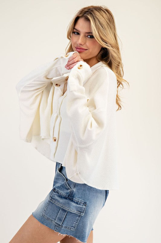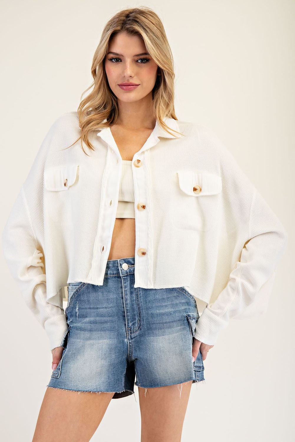 Snow washed textured long sleeve jacket featuring a button down front, a collared neckline, dropped shoulders, two flap chest pockets, buttoned cuffs, dolman sleeves, frayed seams for detail and is cropped length.