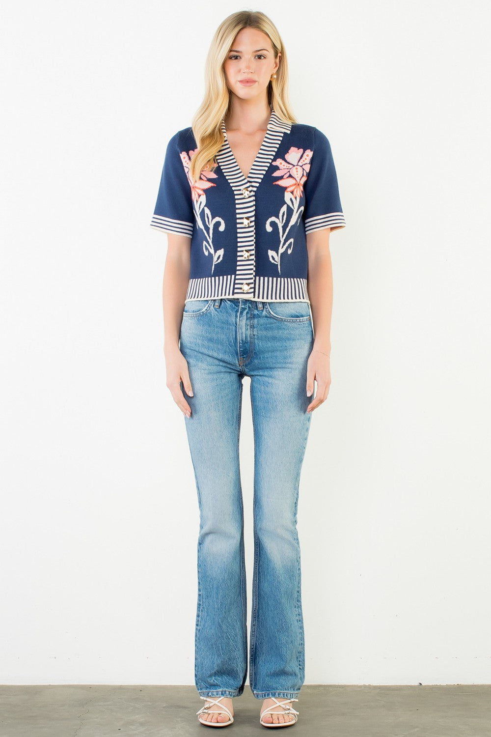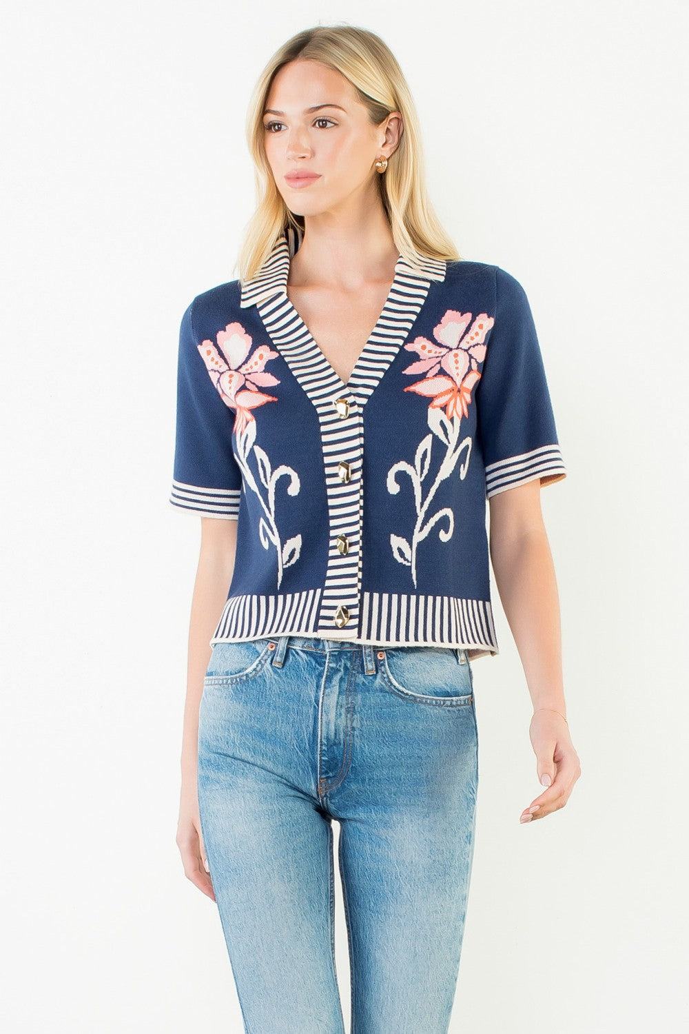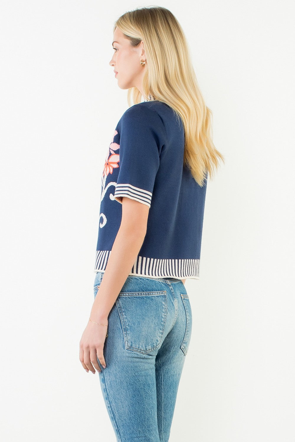 Floral Jacquard Stripe Trim Knit Top