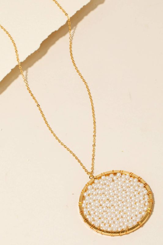 Unleash your inner fashionista with this long necklace embodies a sophisticated glass beaded wire disc pendant long necklace design. The perfect way to complete any outfit, whether you're dressing up or keeping it casual.