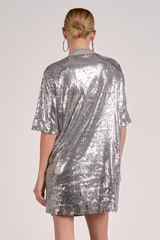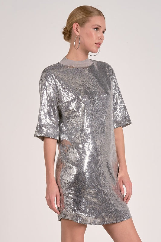 Shine bright every time you walk in wearing Crewneck Silver Mini Dress. This sparkling showstopper features a crewneck neckline, short sleeves, and a flattering shift silhouette that moves effortlessly with every step. Perfect for parties, celebrations, or a night out that calls for all eyes on you.