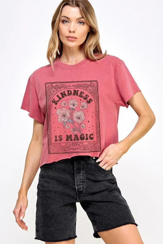 Kind Is Magic Vintage Graphic Crop Top Spread good vibes in this playful vintage-inspired crop top featuring a whimsical "Kind Is Magic" graphic. The relaxed fit and retro aesthetic make it perfect for casual days when you want to remind the world (and yourself) that kindness matters. Pair it with your favorite jeans or layer it over a slip dress for effortless style that doubles as a feel-good statement piece.
