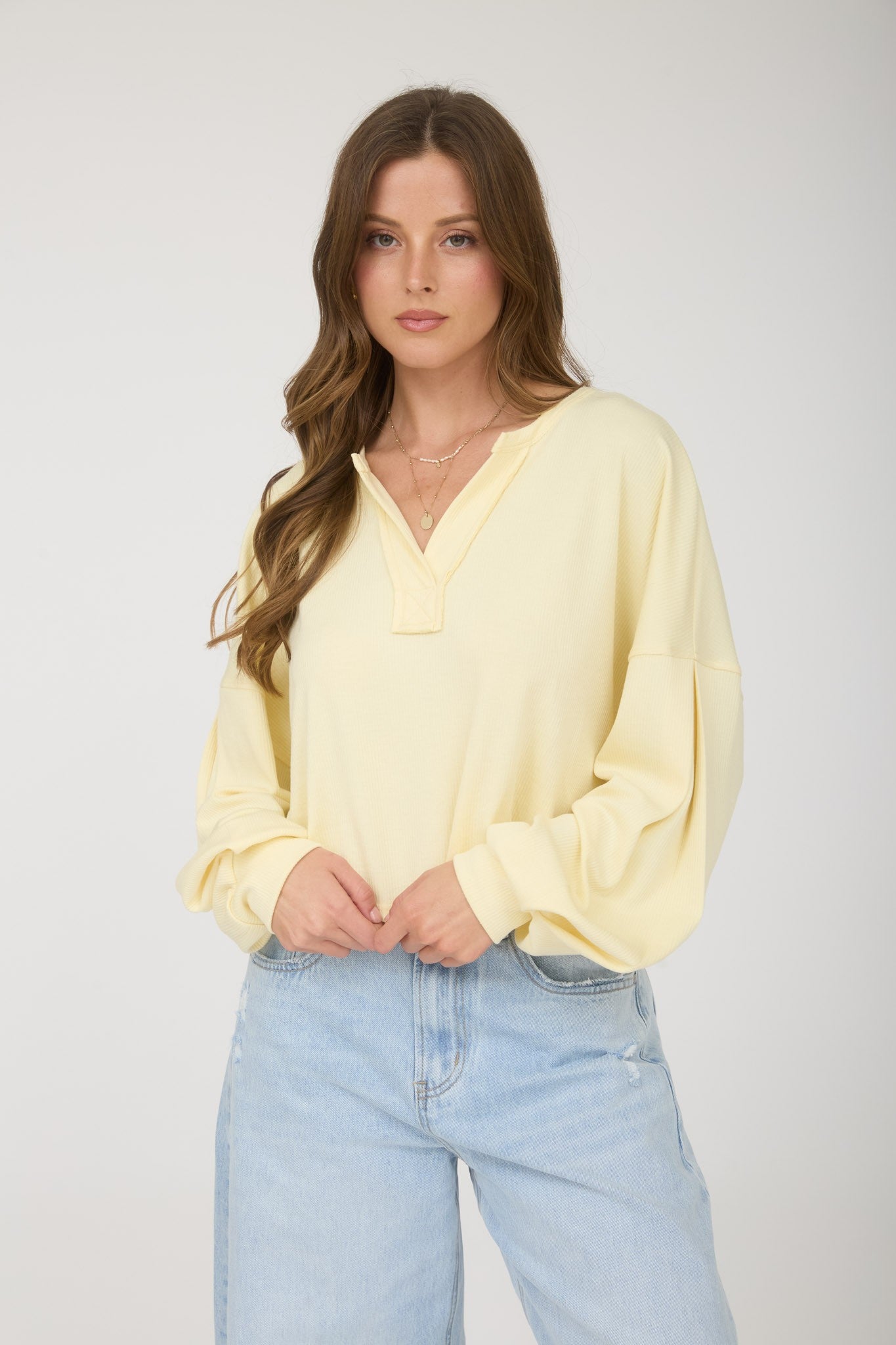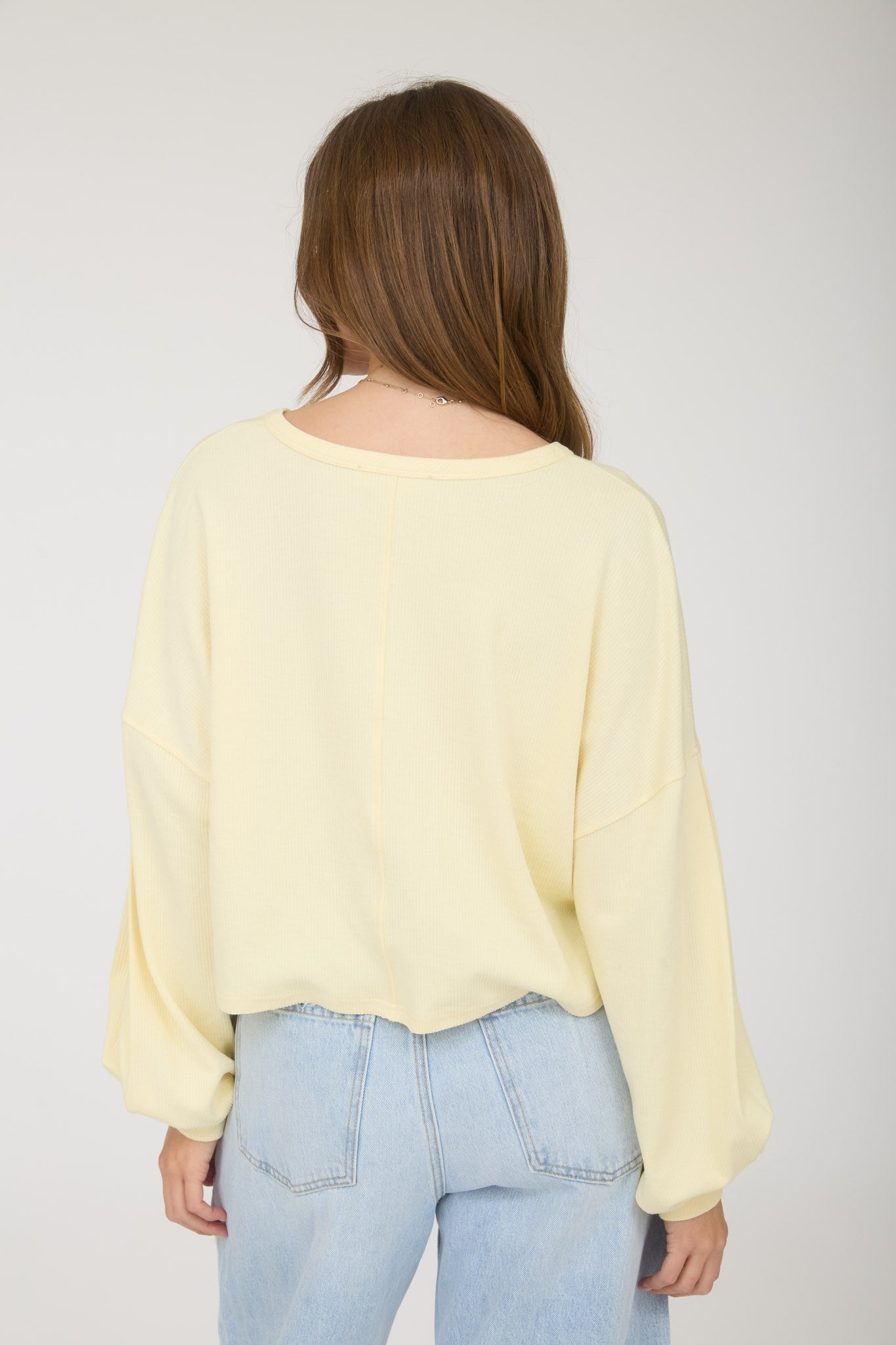 Modern edge meets cozy comfort in this boxy knit top. The split neckline adds an unexpected twist, while long sleeves and exposed seam detailing give it that effortless, fashion-forward vibe. Cropped silhouette pairs perfectly with high-waisted bottoms for a balanced look. Unlined and lightweight, it's your go-to piece for layering or wearing solo when you want to make a statement.