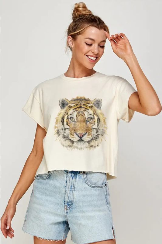Tiger Vintage Graphic Crop Top Show your Mizzou pride in style with this playful vintage-inspired crop top featuring a bold tiger graphic. Perfect for game days, casual hangouts, or whenever you want to rep your team with a fun, retro vibe. The cropped silhouette offers a modern twist on classic college spirit wear, making it an easy go-to for fans who love their Tigers. Comfortable, eye-catching, and unapologetically spirited.