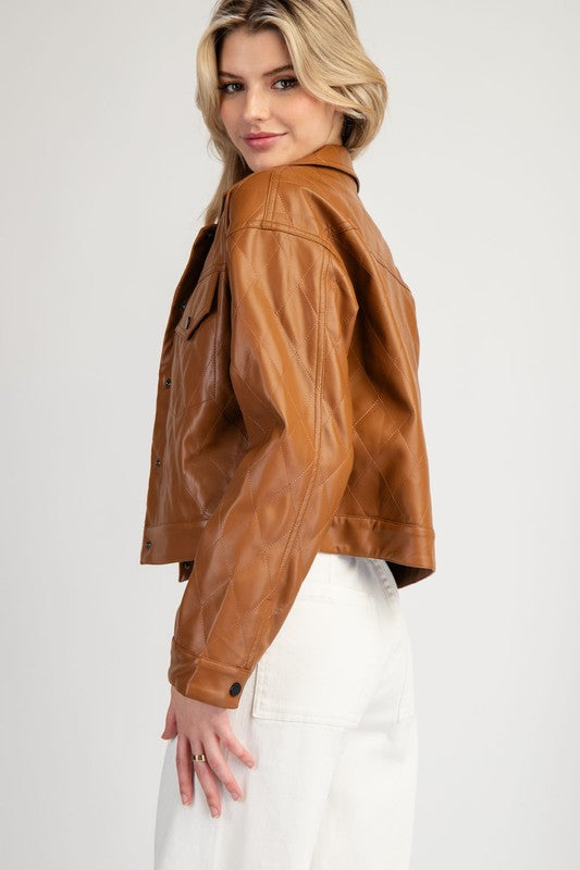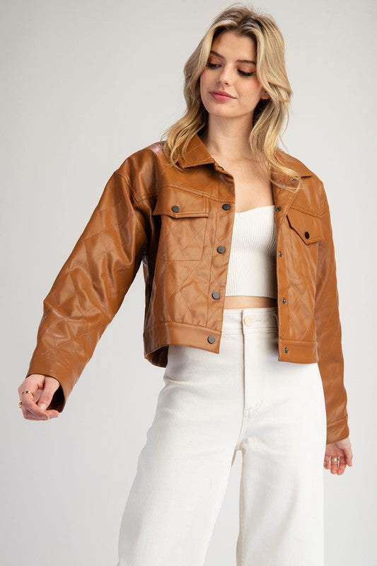 Quilt textured long sleeve jacket featuring a button down front, a collared neckline, buttoned cuffs, two flap chest pockets and is a cropped length.