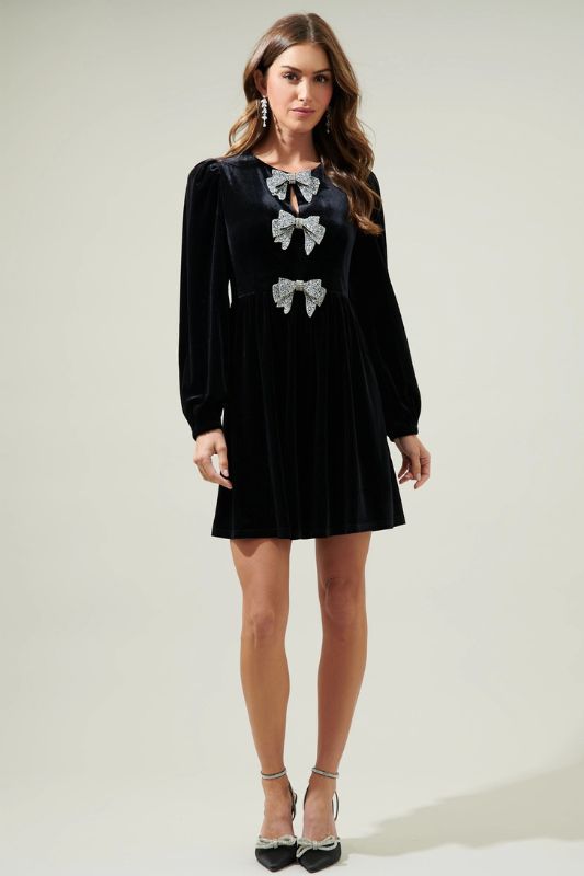 Celebrate any fabulous festivity with a dynamite look like the Glow Bow Velvet Mini Dress! This party-ready dress is composed of stretchy velvet fabric that shapes long sleeves, a round neckline, and a princess-seamed bodice adorned with cute bow-inspired details and flirty keyhole cutouts at the center. It’s so cute to wear with some heels and long earrings to enjoy the day or night!