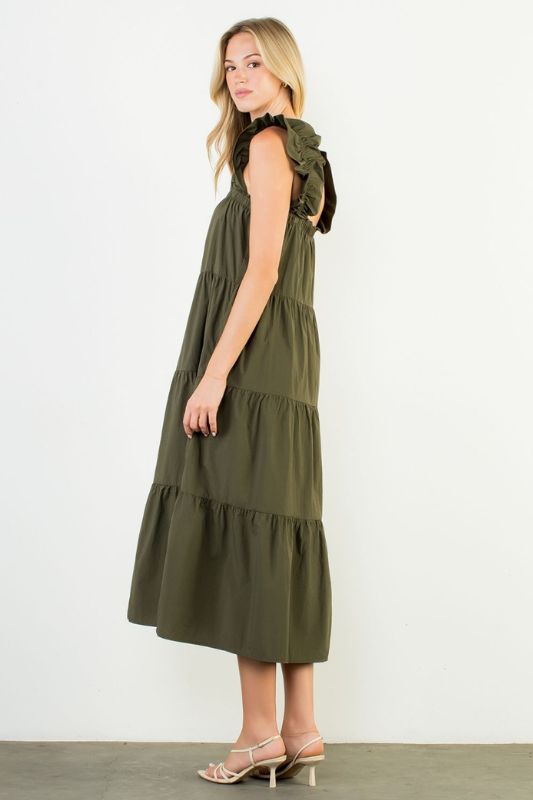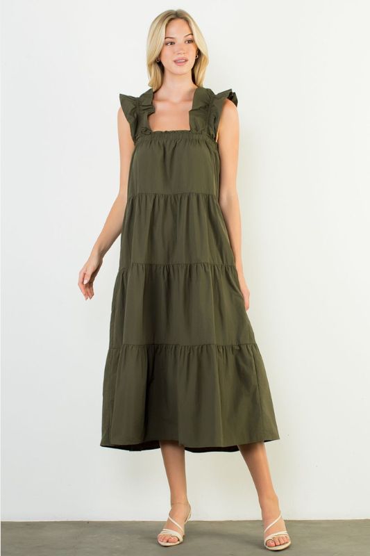 Elevate your wardrobe with this stunning Flutter Sleeve Tiered Maxi Dress, featuring a chic square neckline and delicate ruffle straps that frame the shoulders beautifully. The graceful flutter sleeves add movement and dimension, while the tiered silhouette creates a flattering, flowing look perfect for any occasion. Versatile enough for casual outings or dressed up for special events, this piece is a timeless addition to your collection.