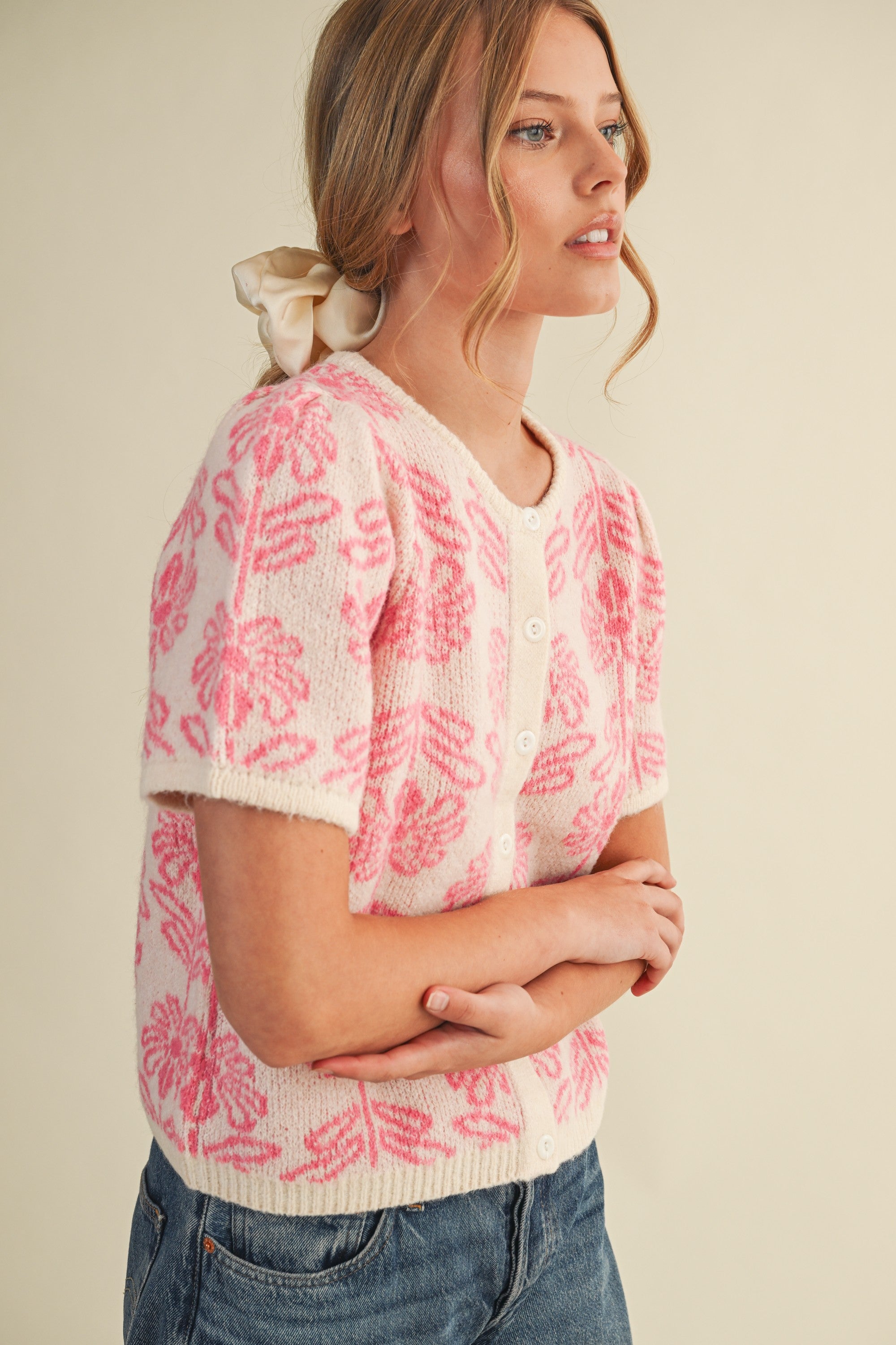 Floral Knit Short Puff Sleeve Sweater Cardigan