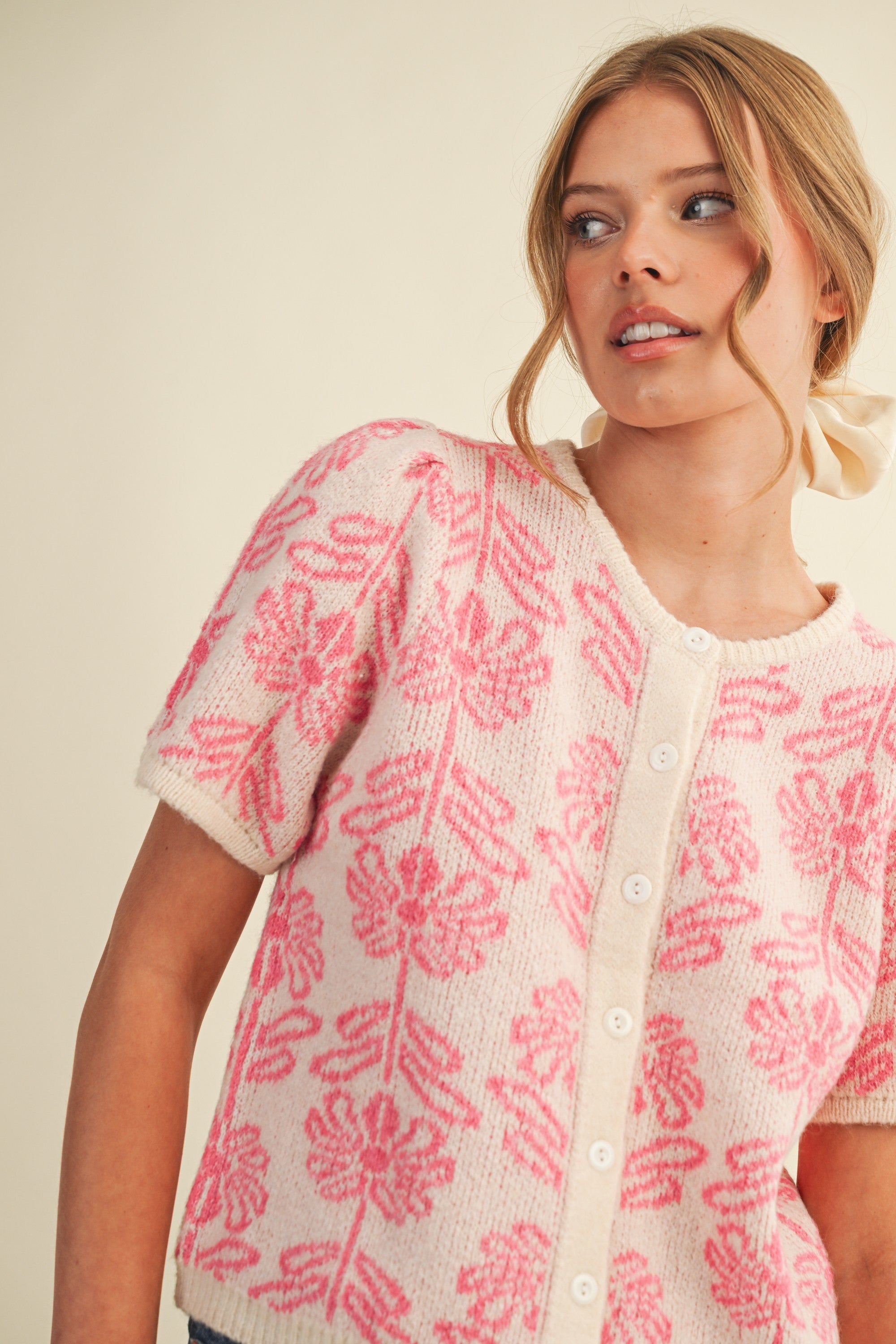 This floral knit cardigan strikes the perfect balance between polish and ease, featuring softly sculpted puff sleeves and a ribbed round neckline that frame the face with understated grace. The relaxed fit and button-down placket provide versatile layering options for any occasion, while the delicate floral pattern adds visual interest without compromising sophistication. A timeless wardrobe staple that pairs beautifully with everything from tailored trousers to flowing skirts.