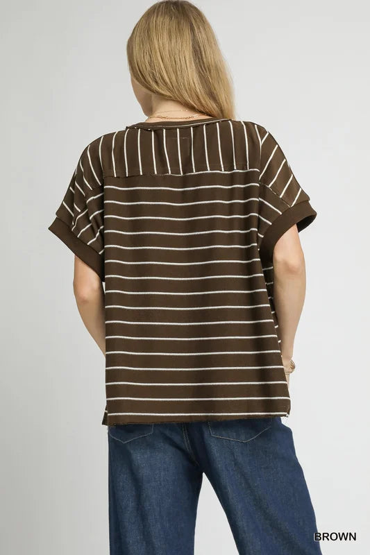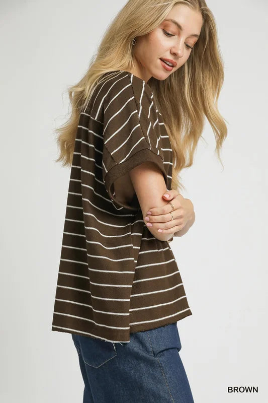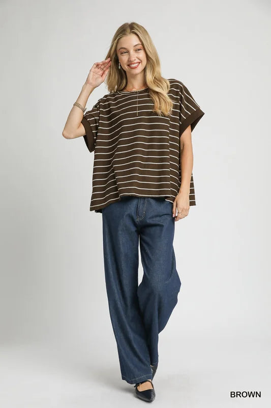 This French Terry Striped Rolled Sleeve Knit Tee combines comfort with casual style, featuring soft, breathable fabric perfect for everyday wear. The rolled sleeves add a relaxed, effortless touch, while the classic stripe pattern enhances your outfit with subtle detail. Ideal for layering or wearing alone, it’s a versatile piece for your wardrobe.