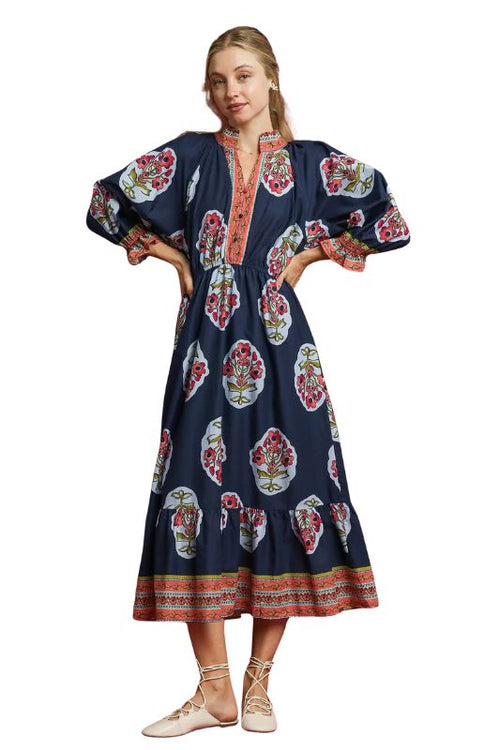 Umgee Flower Patch Boarder Print V-Neck Midi Dress Umgee