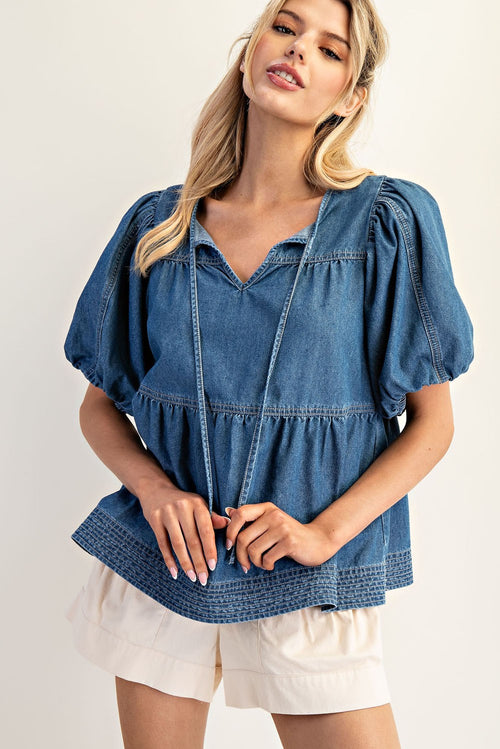 ee:some Soft Washed Denim Puff Sleeve Blouse Top ee:some