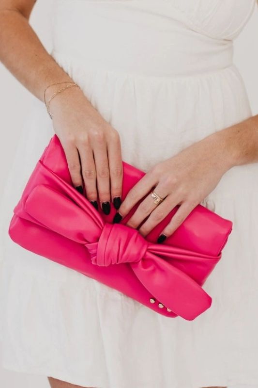 Meet our new favorite bag for every occasion, our Billie Bow Clutch Bag! Available in 5 colors, this bag features a bow on the front, our 3 sisters studs in the corner, a back exterior pocket, an interior zipper pocket, and a chain strap inside. Style it as a clutch, crossbody, or shoulder bag and get ready for a fashion forward day!