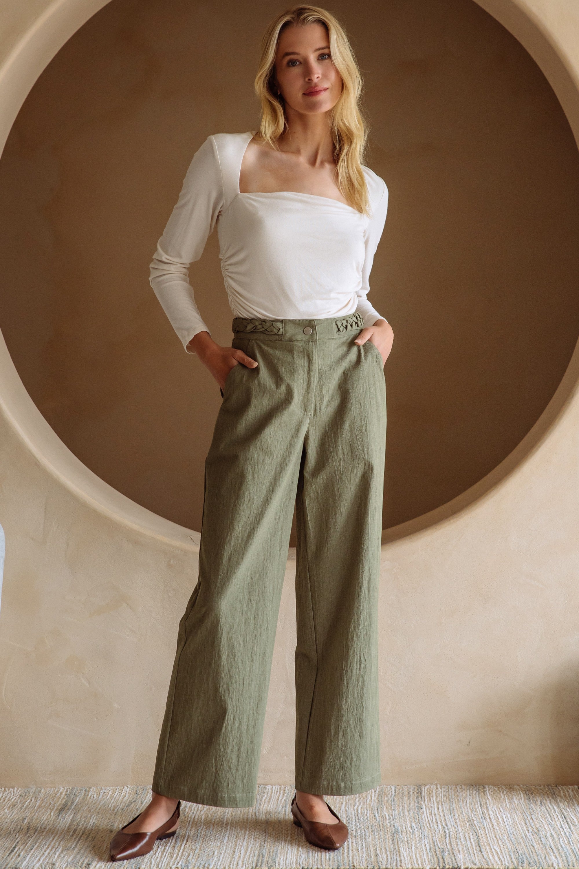 Elevate your wardrobe with these Braided Waist Straight Pants, designed to blend timeless elegance with modern comfort. The carefully crafted braided waist detail adds a refined touch, perfectly complementing the clean, straight-leg silhouette. Crafted for a sophisticated look, these pants offer a flattering fit ideal for both professional settings and chic casual outings. Experience an effortless blend of style and grace with every wear.