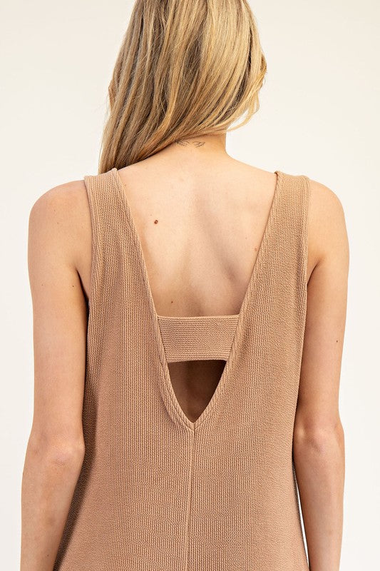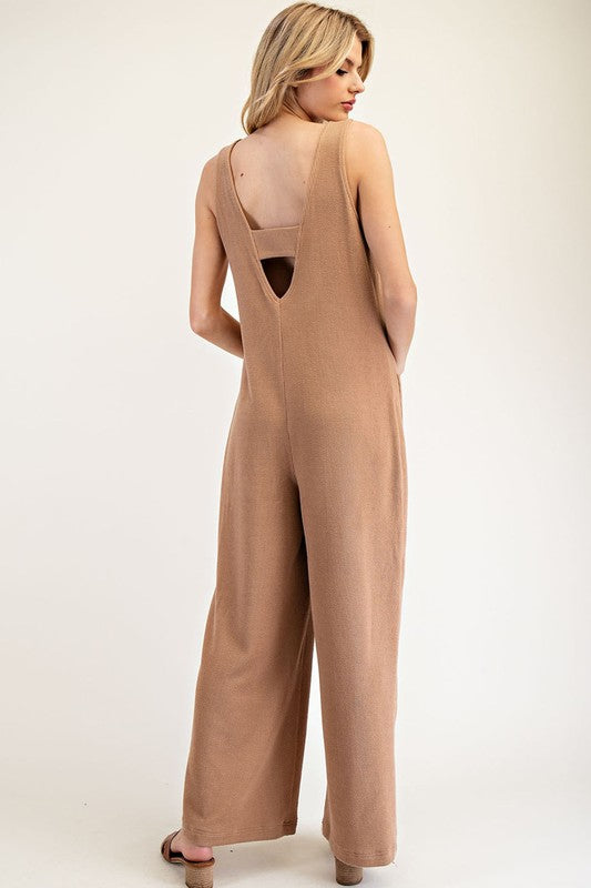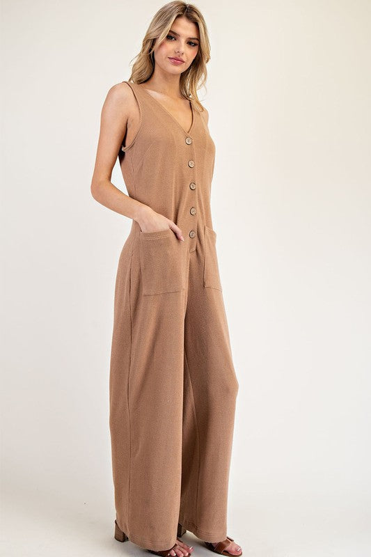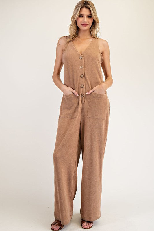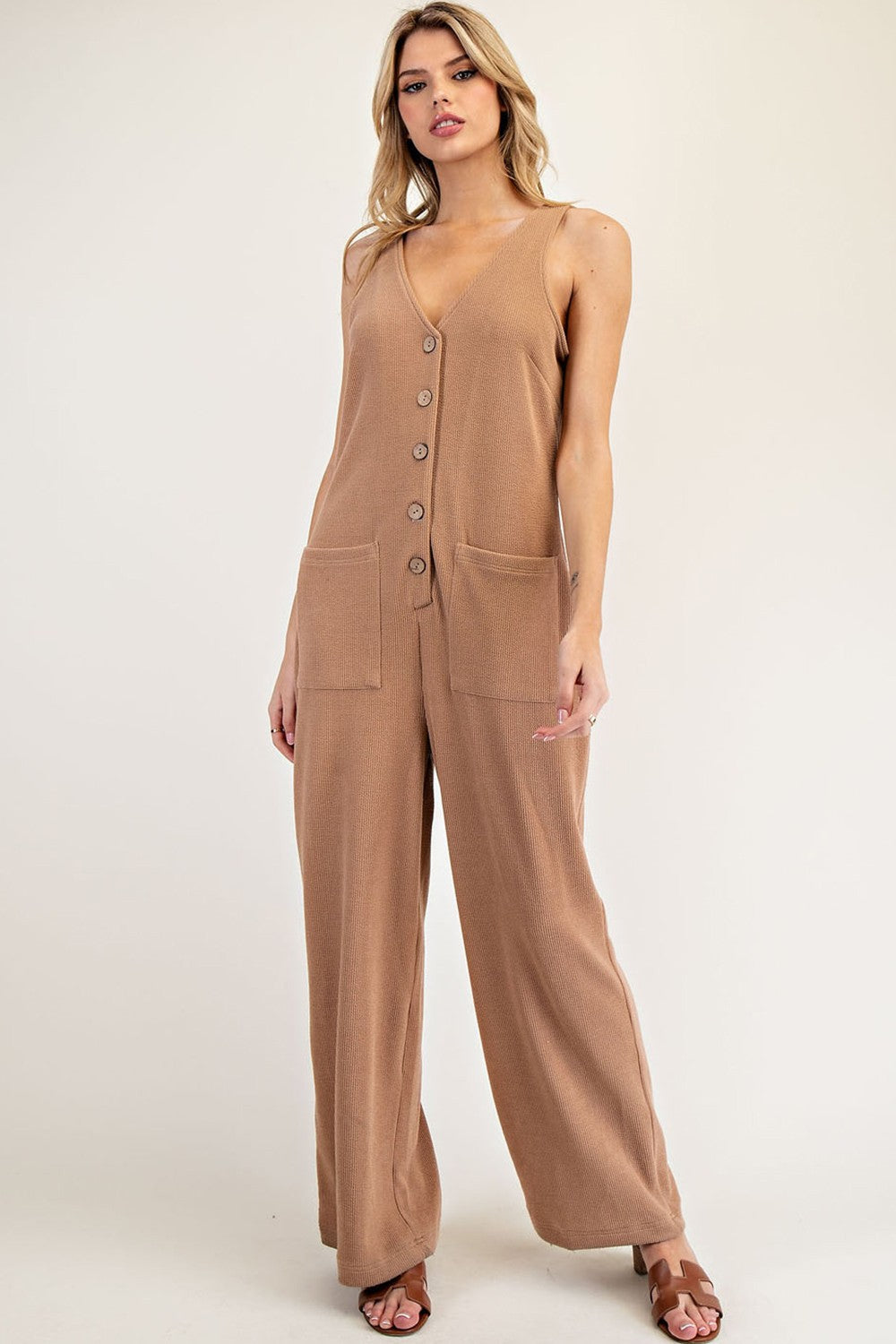 Sleeveless jumpsuit featuring a halfway button down front, a V-neckline, two open front pockets, a keyhole design in the back and is a straight leg design. Model is 5'8" and is wearing a small.