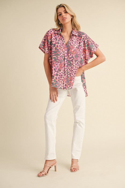 Multicolor leopard top with open collared neck, front faux hidden button-up detail, short sleeves and asymmetry hemline. - Non-sheer, lightweight. - Model is 5'7'' and is wearing a Small.