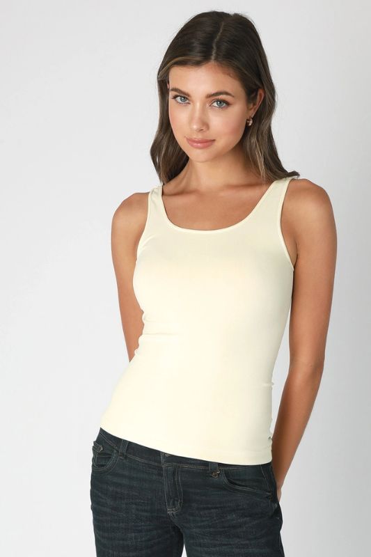 A shorter length seamless tank top with a scoop neckline and wide straps.