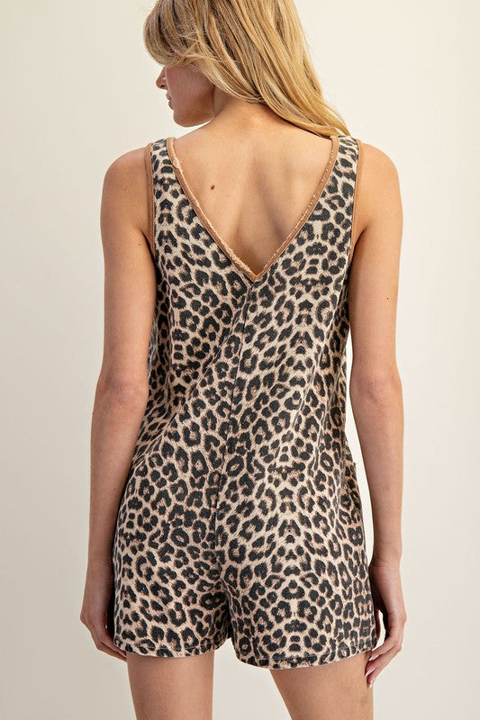 This romper showcases a bold leopard print, contrast patch pockets with raw edge detailing, a V-neckline and back, a side zipper closure, and a relaxed silhouette for an effortless off duty look.