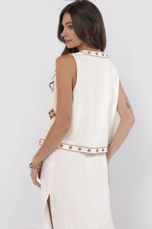 Add a splash of sunshine to your wardrobe with the Warm Horizon Embroidered Vest. This ivory open vest is playfully detailed with rust-colored embroidery, making it the perfect layer to brighten up any outfit. Light, lively, and full of charm, it’s your new go-to for effortless style and cozy vibes.