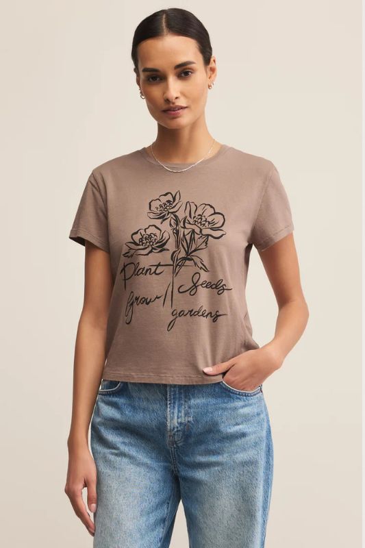 This short sleeve crew neck tee features a “Plant Seeds, Grow Gardens” floral graphic that adds a playful, thoughtful touch. Made from soft-hand cotton jersey with an enzyme wash, it has a relaxed fit that feels easy, comfy, and ready for wherever the day leads.